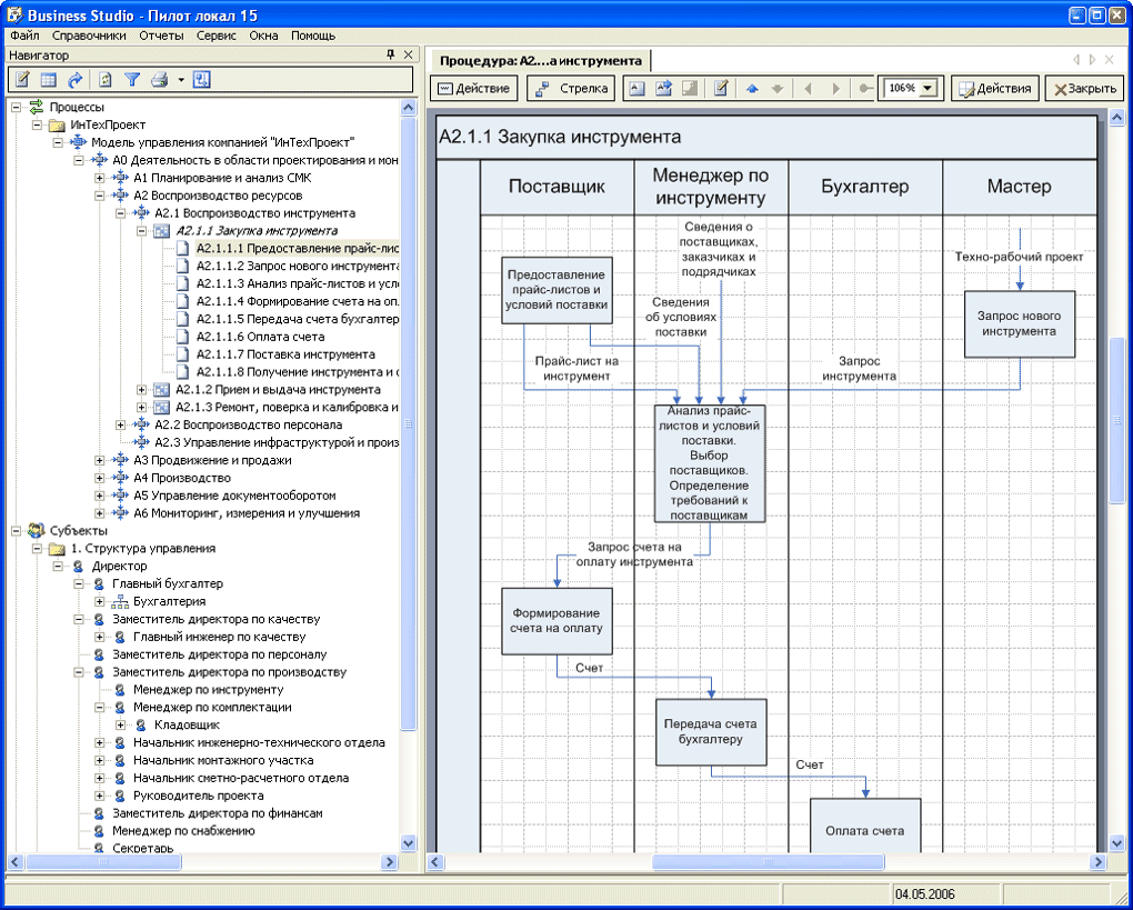 Такое описание деятельности предприятия можно сделать самостоятельно или привлечь внешних консультантов. Очень важно, чтобы разработанная модель была понятна руководителям и чтобы они осмыслили и приняли ее. Все разногласия необходимо устранить до начала выбора информационной системы. Учитывая, что такое описание выполняется в свою очередь с помощью систем бизнес-моделирования, то особое внимание необходимо уделить выбору такой системы. Для решения этой задачи можно использовать западные системы (Aris, AllFusion Process Modeler), но сегодня появились и более доступные по стоимости отечественные системы (Business Studio).