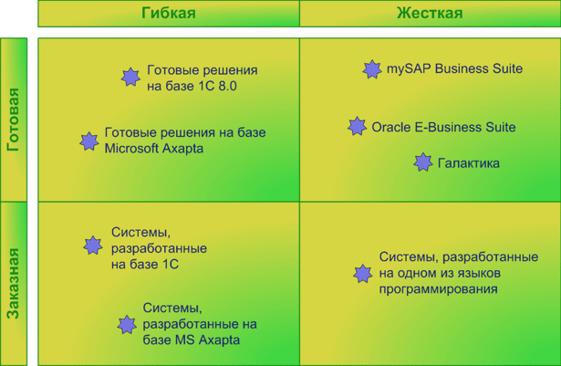 Все системы автоматизации можно разделить на два класса: жесткие — с набором типовых настроек (mySAP Business Suite, Oracle E-Business Suite, Галактика) и гибкие — с возможностью модифицировать функциональность (1 °C, Microsoft Axapta). Это касается систем любых классов, начиная от систем для решения локальных задач, до комплексных систем автоматизации деятельности крупных предприятий.