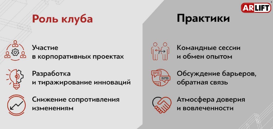 Открытость, ориентация на результат и вовлеченность – эти ценности помогают команде поддерживать трансформации и участвовать в реализации проектов. Мы понимаем, что изменения даются компаниям по-разному. Иногда даже небольшое улучшение требует значительных усилий. Для того, чтобы идея переросла в реализуемый проект, компании обязательно необходимы лидеры. Это те инициативные сотрудники, которые «горят» идеей и готовы довести ее до результата. Они формируют клуб лидеров ARLIFT, и каждый из них – на вес золота.