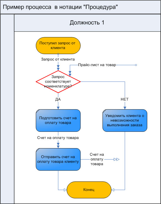 Заметим, что стрелки типа «Связь предшествования» можно не именовать. Но автор статьи придерживается стиля, при котором такие стрелки именуются в терминах событий, например: «Запрос не соответствует номенклатуре», «Счет на оплату подготовлен». Это делается исключительно с целью повышения визуальной наглядности схемы для пользователей.