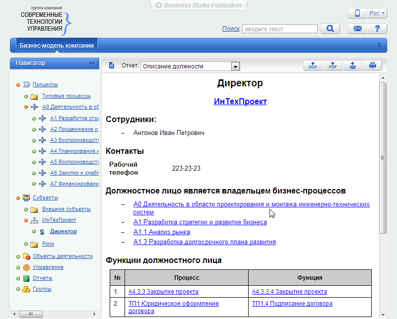 - Сохранение документов и моделей из Бизнес-портала в виде файлов (DOC, PDF), например для редактирования, печати или отправки по электронной почте;