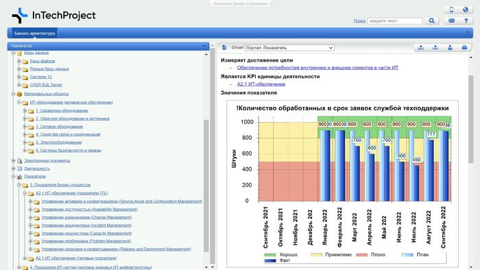- Область просмотра моделей и документов (справа). Все документы включают большое количество активных гиперссылок, что значительно облегчает навигацию. Например, в карточке ИТ-системы указаны все бизнес-процессы, процедуры и функции организации, которые она автоматизирует. При нажатии на конкретный бизнес-процесс мы переходим в его регламент. Во время просмотра регламента нам встречается раздел «Показатели KPI». При нажатии на конкретный показатель мы переходим из регламента в карточку показателя, которая включает подробную статистику его значений (план-факт) и графики. Из карточки показателя можем затем перейти в должностную инструкцию сотрудника, который за него отвечает, и так далее.