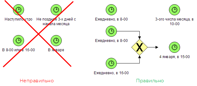 На рис. 1 слева показаны неправильные примеры. Таймер нельзя выставить на неопределенное, нечеткое, абстрактное время. Также таймер не показывает предельный срок выполнения какой-то задачи. Нельзя писать на таймере «Не позднее … чего-то». Невозможно выставить таймер одновременно на два разных времени (попробуйте сделать это с будильником на своем смартфоне).