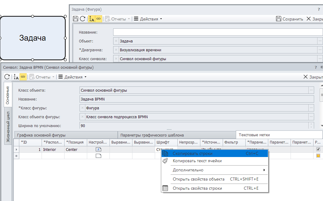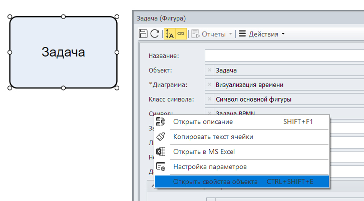 После того, как вы заполните атрибут «Требования к срокам», нужно по правой кнопке открыть «Свойства фигуры», а затем, наведя курсор на «Символ», по правой кнопке выбрать «Открыть свойства объекта».