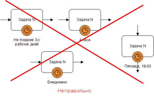 Некоторые процессные аналитики всерьез полагают, что красивые «часики» специально сделаны для того, чтобы визуализировать нормативное или предельное время выполнения задач процесса. Это заблуждение. Если вы видите такое использование таймеров на модели, то это означает, что ее автор не знает нотацию BPMN.