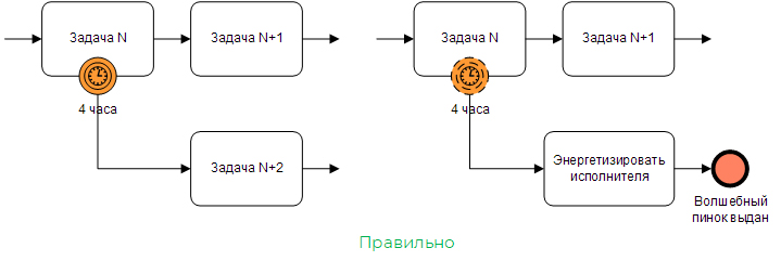 На рис. 4 показаны правильные примеры использования граничного события-таймера. Слева показано граничное событие-таймер прерывающего типа. Работает это так. Если Задача N выполняется дольше 4 часов, то ее выполнение прерывается и токен переходит на Задачу N+2. При этом Задача N+1 уже никогда не будет запущена.