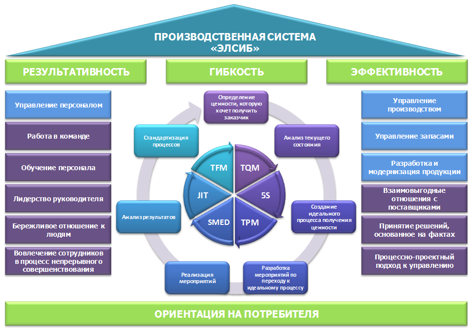 Практически, производственная система «ЭЛСИБ» обеспечивает управление качеством в широком смысле, как основы деятельности — качеством процессов, компетенций и т. д., а не только качеством продукции (Рис. 2).