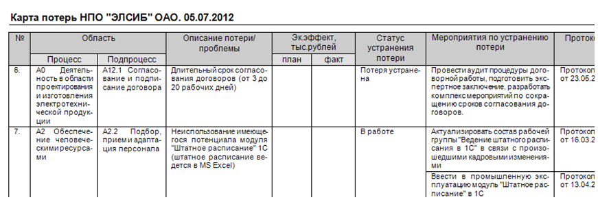 Модуль управления потерями в бизнес-процессах, содержащий информацию об идентифицированных проблемах, планах мероприятий по устранению потерь и мониторингу их выполнения;