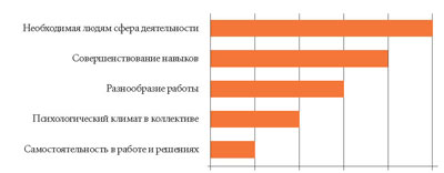 Результаты анкетирования персонала, в частности, выявили совпадение ожиданий и целей деятельности у сотрудников и руководства, распределение рабочего времени по должностям и его перерасход, удовлетворение своей деятельностью и деятельностью учреждения, отношение к руководству и многое другое. Интересным результатом стало выявление мотивов деятельности сотрудников, среди которых материальное стимулирование заняло лишь восьмое место из десяти (рейтинг пяти мотивов — см. рис. 2). Ключевыми показателями, которые руководители взяли за основу для реагирования, стала удовлетворенность персонала работой в учреждении, выраженная в процентах, а также предложения по усовершенствованию деятельности.