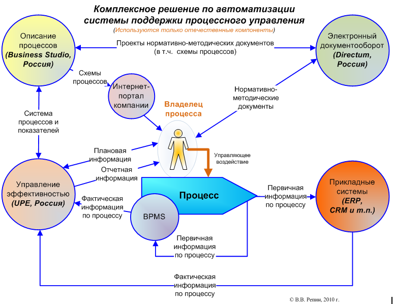 Важнейшей составляющей комплексного решения по автоматизации системы поддержки процессного управления является программное обеспечение класса Business Performance Management — BPM. Система функционирует следующим образом. Данные из прикладных систем поступают в хранилище системы BPM. Далее при помощи возможностей системы (средство ввода данных, информационные панели управления, функционал
