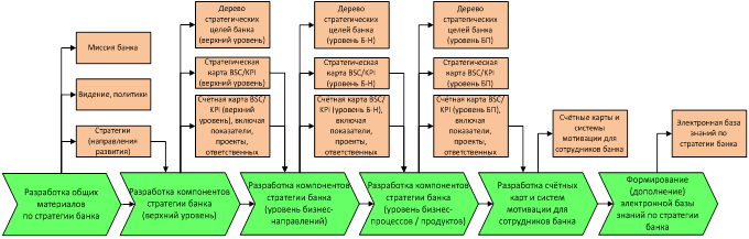Далее на основе компонентов стратегии верхнего уровня разрабатываются аналогичные компоненты для уровня бизнес-направлений банка: розничный бизнес, корпоративный бизнес, межбанковский бизнес, Private Banking и т. д.