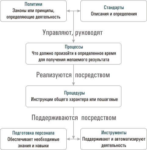 Как можно решить ставшие общими проблемы? Начать следует с понимания того, что не вся документация используется одинаково: «документация по процессу» может относиться и к политике, и к стандартам, и к процессам и процедурам. В табл. 2 показаны различные виды документов по процессу и описано, как каждый из них используется. В дополнение к этому на схеме документации (схема 1) показаны некоторые важнейшие их взаимосвязи.