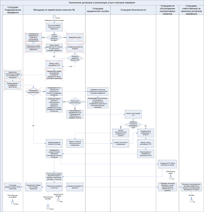 В первую очередь были проанализированы обращения клиентов — потребителей данного сервиса, учтены их замечания и предложения в рамках заключения договора и реализации услуги. Далее был проведен опрос участников процесса «Заключение договоров и реализация услуги «Торговый эквайринг» — представителей