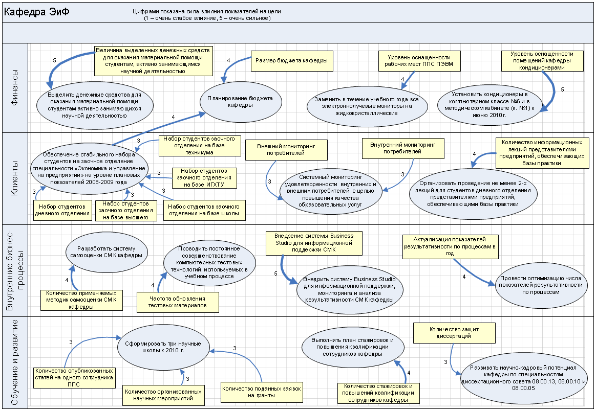 На стратегическую карту были перенесены основные цели кафедры и показатели её достижения. Для большей информативности сила влияния показателя на достижение цели показана не только графически — толщиной стрелки от показателя к цели, но и численно — баллом от 1 до 5. Заполнять значения показателей планируется один раз в год (в конце учебного года) с использованием механизма рассылки писем ответственным лицам. По мере накопления информации руководство кафедры будет отслеживать динамику изменений, и вносить соответствующие коррективы.