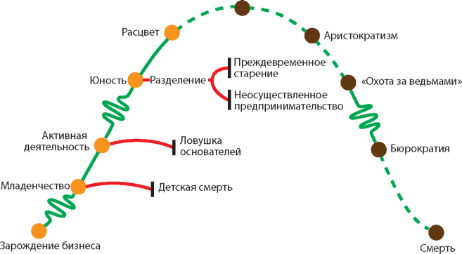- Организация может избежать старения, если в период между стадиями «Юность» и «Расцвет» предложит новую бизнес-идею (или принципиально модифицирует старую), чтобы к моменту достижения уровня «Стабильность» иметь возможность превратить новый бизнес в основной.