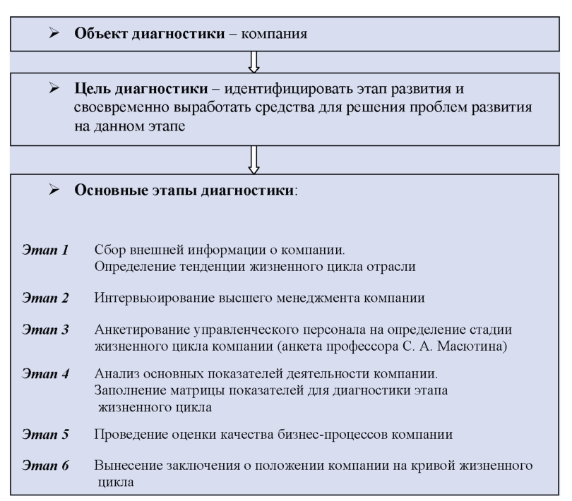 Процесс диагностики предлагается осуществлять поэтапно. Основные элементы, позволяющие определить этап жизненного цикла компании, представлены на рисунке 2.