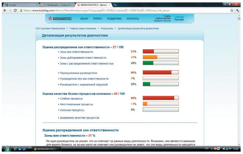 Оценка качества бизнес-процессов компании проводилась на базе системы бизнес-моделирования с помощью онлайн-системы организационной диагностики BIZDIAGNOSTICS, которая содержит в себе два блока оценки: распределения зон ответственности и качества бизнес-процессов компании (рис. 4).