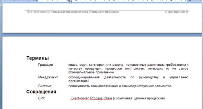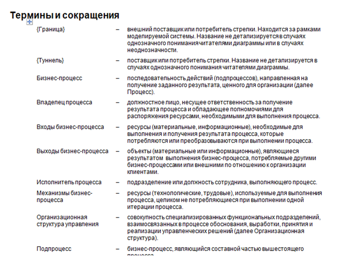 Рисунок 3. Фрагмент раздела «Термины и сокращения» стандартного отчета «Регламент процесса»