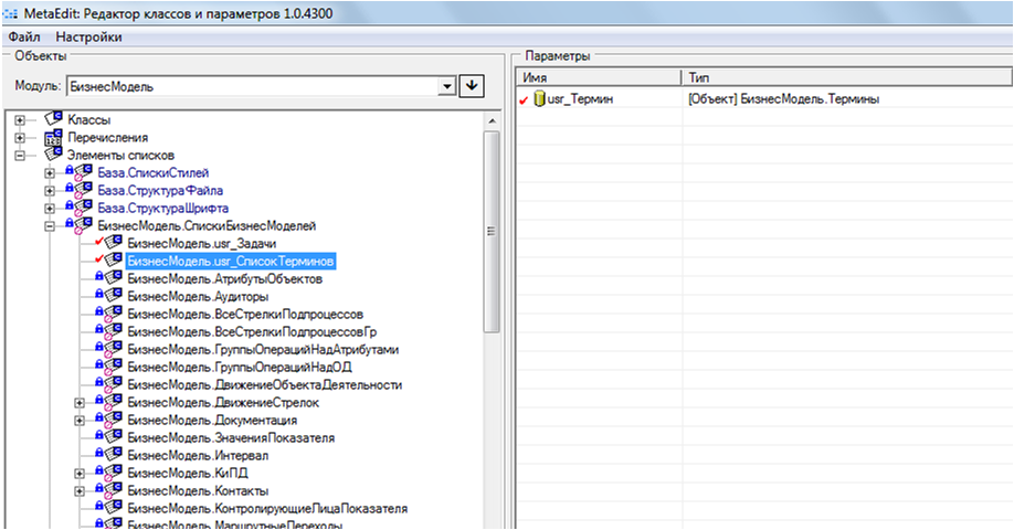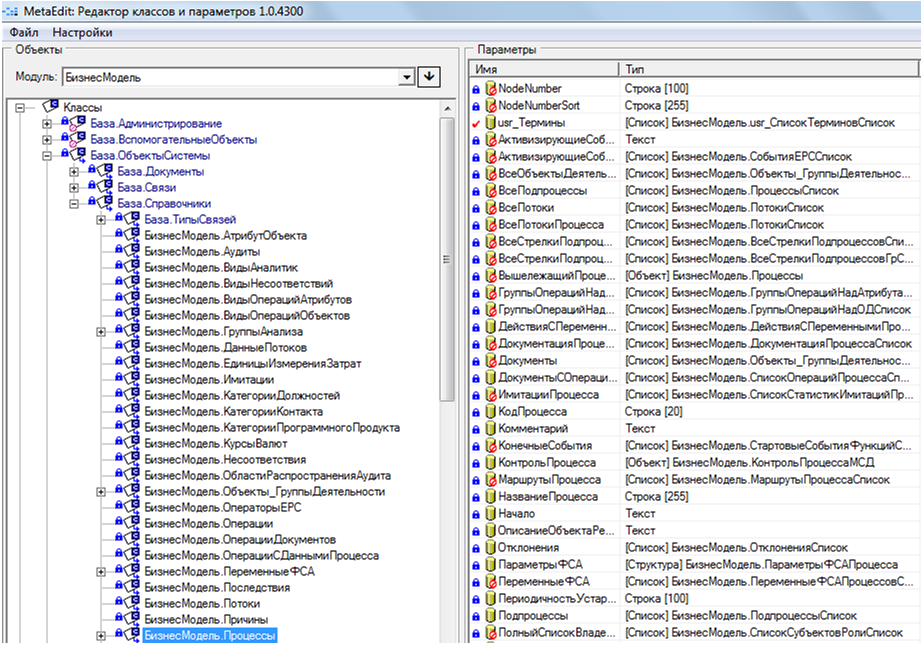 Но вернемся в Meta Edit. Итак, мы выбрали нужный нам модуль. И теперь можем поработать с параметрами класса «Процессы» (Рисунок 9). Мы добавим в свойства процесса сложный параметр типа «Список», в который, собственно, и будем добавлять термины, связанные с конкретным процессом.