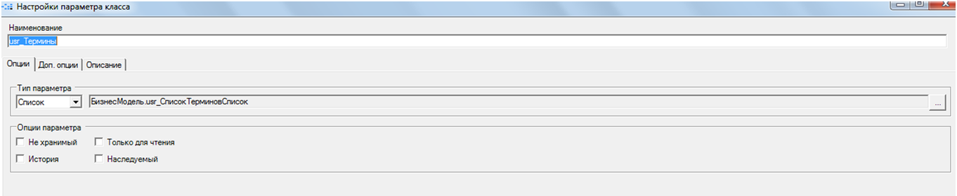 Теперь вернемся к параметрам класса «Процессы» и создадим там параметр «Термины» (Рисунок 9). Свойства этого параметра заполним так, как показано ниже (Рисунок 14, Рисунок 15, Рисунок 16).