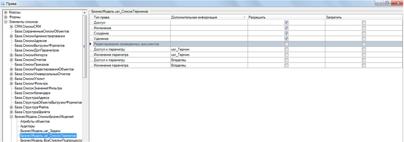 Затем при помощи гиперссылки «Редактирование прав» откроем для изменения соответствующую категорию прав. Установим доступ к пользовательским параметрам так, как это показано на рисунках ниже.