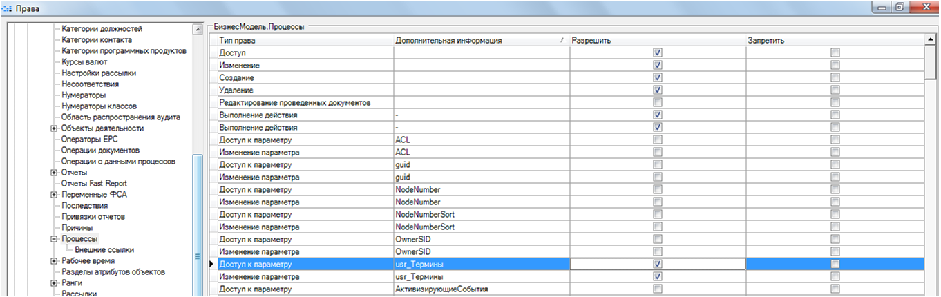 Второй этап (Рисунок 4) закончен. Закрываем окно «Права» и возвращаемся в пользовательский интерфейс при помощи команды «Сменить интерфейс» меню «Окна». Теперь созданные нами параметры доступны для работы. Связывание термина с процессом осуществляется стандартным для Business Studio методом Drag and Drop. Просто перетащите нужный термин на вкладку «Термины и сокращения» свойств процесса (Рисунок 24).