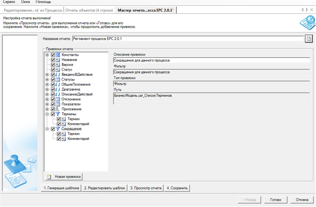 Самое время приступить к работе с шаблоном отчета: нам требуется организовать в регламенте процесса место для вывода интересующей нас информации. Вместо раздела «Термины и определения» я создал два раздела «Термины» и «Сокращения», в каждый из которых добавил привязку типа фильтр, соответствующую разделу.