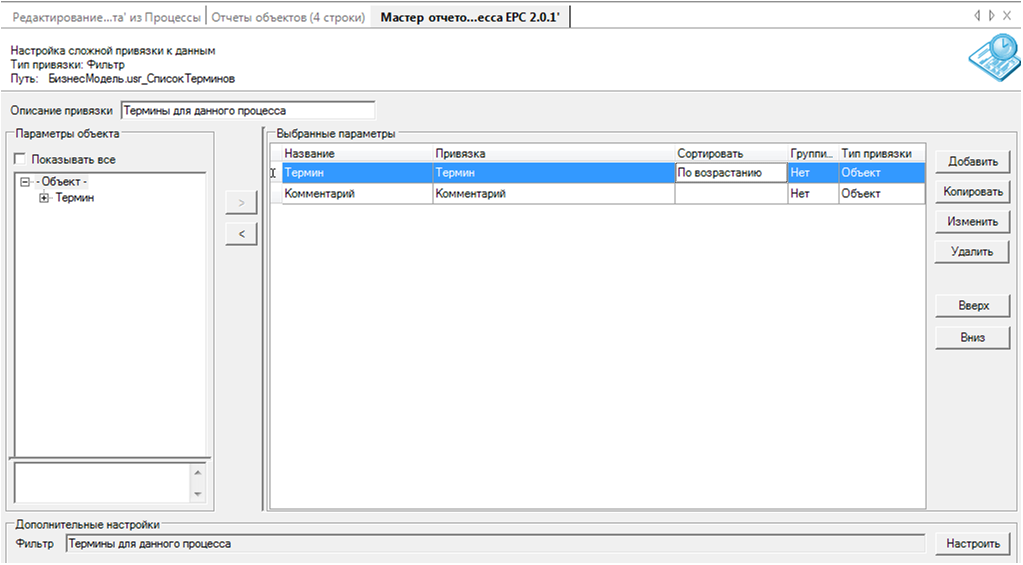 Рисунок 29. Добавление привязок типа фильтр в структуру привязок отчета