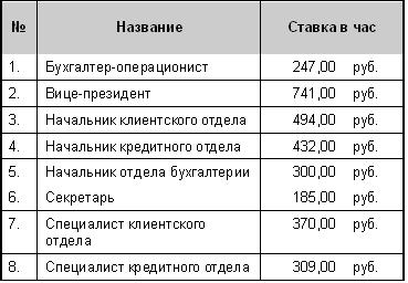 В процессе оформления кредитных досье в банке задействованы сотрудники различных подразделений, примерная стоимость работ которых приведена в таблице. Суммы указаны с учетом ЕСН и НДФЛ, другими словами, стоимость работ сотрудников несколько ниже среднерыночной.