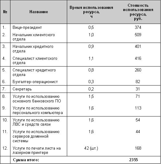 Средние суммарные затраты на оформление одного кредитного досье с учетом описанных выше работ, рассчитанные с использованием метода ФСА, приведены в таблице: