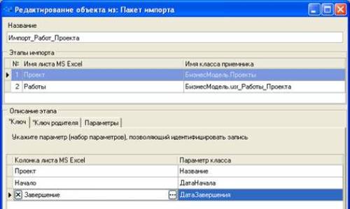 Соответствие параметров Работ проекта задаются на соответствующих вкладках пакета импорта: