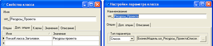 Для закладки «Ресурсы проекта» параметры списка и параметр класса «Проекты»: