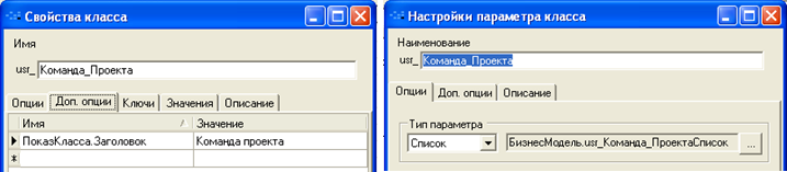 Для закладки «Команда проекта» параметры списка и параметр класса «Проекты»: