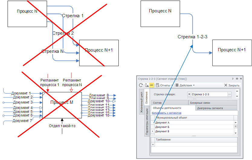 Почему я считаю такой метод к моделированию некорректным (перечеркнут красным крестом)? Логика очень проста. Если мы соединили два процесса связью («трубой»), к которой в Business Studio можно прикрепить реальные документы, то зачем создавать несколько стрелок связи между двумя объектами? Из-за этого диаграмма становится чрезмерно сложной – как микросхема. Поэтому я использую способ, показанный на рис. 1 справа вверху – одна стрелка соединяет два процесса, при этом к ней можно привязать несколько документов из справочника (см. скрин).