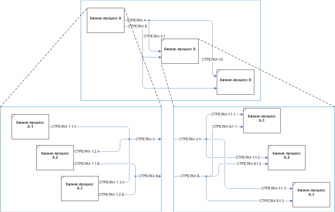 При декомпозиции процесса стрелки в IDEF0 переходят с уровня на уровень, как показано на рис. 2. Например, «Стрелка Б», выходящая из «Бизнес-процесса А», входит в «Бизнес-процесс Б». Стрелки, как и функции, так же можно «декомопозировать»: «стрелка Б» разделяется на «Стрелку Б 1.1», «Стрелку Б 1.2» и «Стрелку Б 1.3».