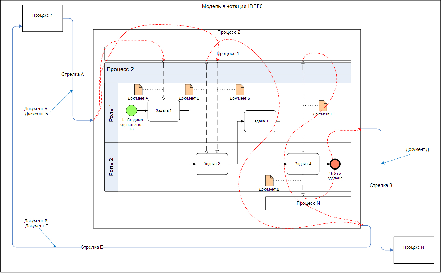 На рис. 3 показан простой пример. В общем случае, для руководителя, читающего диаграммы IDEF0, гораздо сложнее проследить поток документов, выходящий из внешней сущности на контекстной диаграмме, проходящий через 2-3 уровня декомпозиции и входящий в конкретный процесс. Но это особенность любой архитектурной процессной модели. При использовании, например, VAD ситуация может быть еще хуже, так как стрелки на диаграммах верхнего уровня вообще, как правило, не показывают. С другой стороны, отказаться от моделей верхнего уровня и делать просто одноуровневый реестр кросс-функциональных процессов в нотации BPMN – тоже не выход. В этом случае не видна вся картина бизнеса.