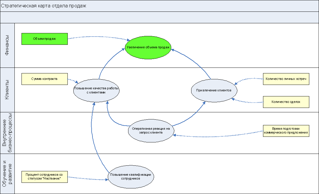 Заместитель директора по коммерции решил вертикально (вовлечение других уровней управления) каскадировать цель «Увеличение объема продаж». Для этого руководствуясь принципом партнерства [3], заместитель директора по коммерции совместно с начальником отдела продаж строят соответствующую стратегическую карту отдела продаж (Рисунок 7). На этой карте из вышестоящей ССП перенесена цель «Увеличение объема продаж» и соответствующий ей показатель. Наряду с этой целью определены другие цели и показатели, имеющие стратегическое значение для подразделения (Таблица 2). Данный метод каскадирования называется комбинированным. Таким образом, руководитель отдела продаж отвечает за достижение целей стратегической карты отдела продаж. По такому же принципу ССП каскадируется до уровня рабочего места.