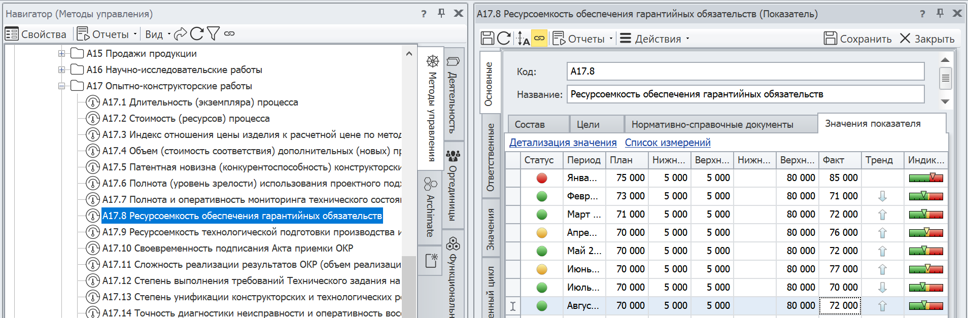 - Определение показателей для измерения целей осуществляется в разделе навигатора «Методы управления» в подразделе «Показатели», а их описание (включая план-факт значения) в карточке «Свойства» показателя (рис.10).