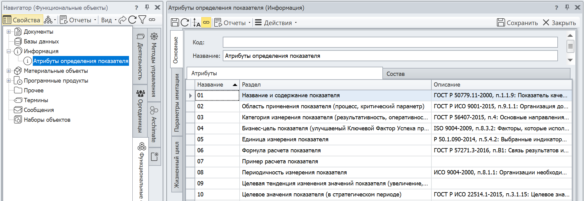 - Для документирования атрибутов определения показателя можно использовать информационный объект, для чего в разделе навигатора «Функциональные объекты» в подразделе «Информация» создать соответствующий объект, в карточке «Свойств» которого на вкладке «Атрибуты» указать следующие сведения (рис.11):