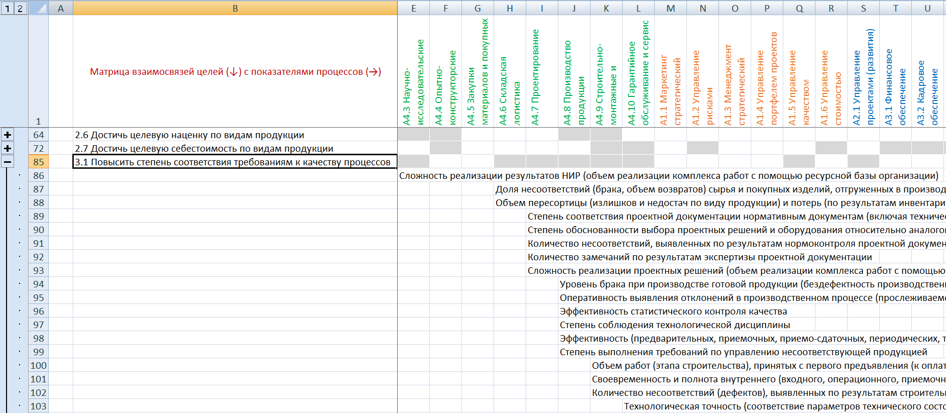 Для выполнения указанных требований необходимо определить процессы организации, показатели деятельности для этих процессов и поставить в соответствие стратегическим целям организации соответствующие показатели процессов, например с помощью матричного представления (рис.2).