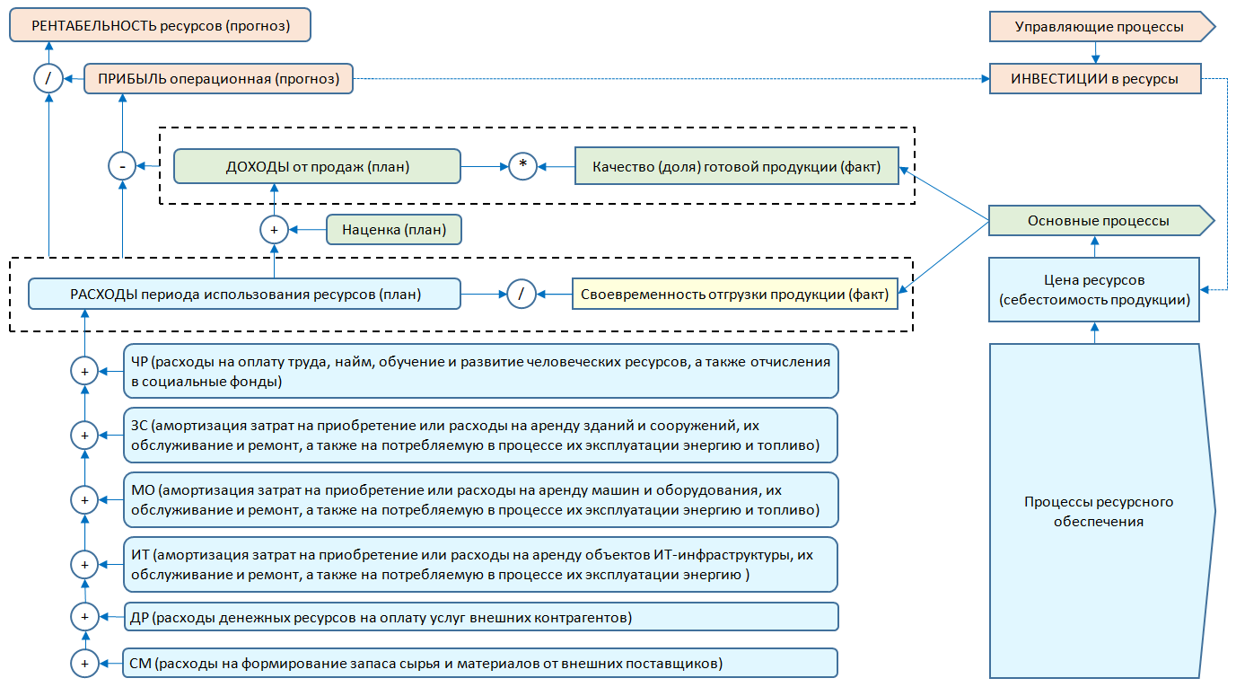 - «Цена» определяется стоимостью ресурсов организации, отражается бюджетными статьями расходов и обуславливает себестоимость продукции, при этом длительность (своевременность завершения) операционного цикла обуславливает фактический период и объем потребления ресурсов;