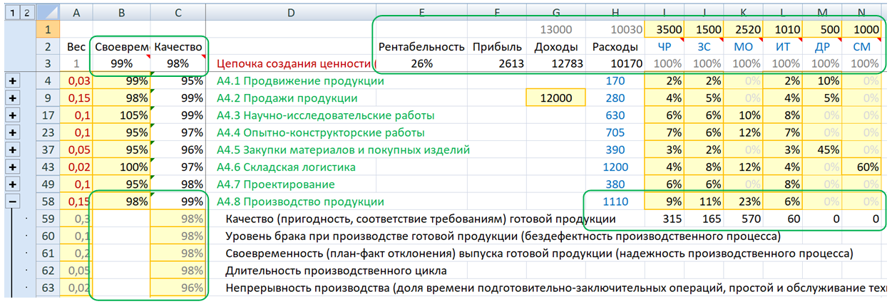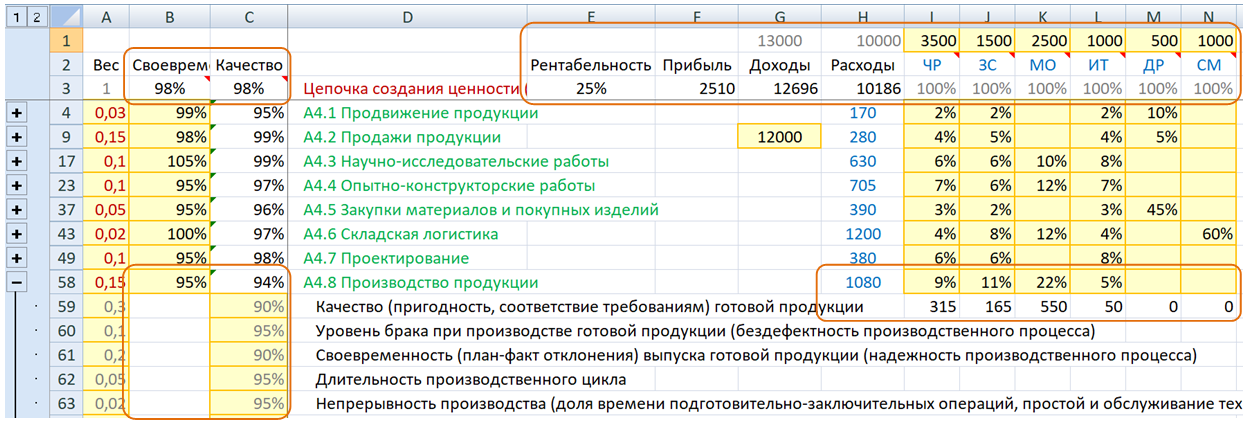 Таким образом, с учетом предполагаемого роста Прибыли организации с 2510 до 2613 (прирост на 103) ден.ед. в каждом отчетном периоде можно оценить допустимый период окупаемости инвестиций и принять управленческое решение об осуществлении инвестиционного проекта улучшения процесса «А4.8 Производство продукции» и деятельности организации в целом. Например, срок окупаемости инвестиций в объеме 1500 ден.ед. составит примерно 15 отчетных периодов.