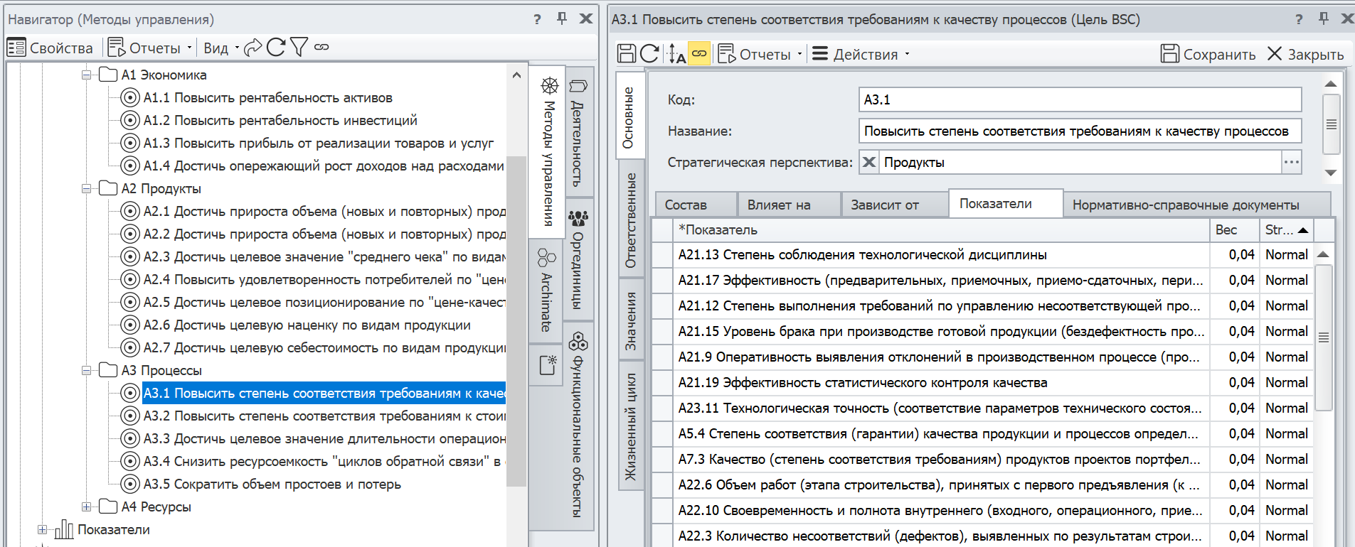 Рис.9. Справочник «Цели BSC» и карточка свойств цели