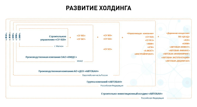 С 1989 года компания выступала в роли субподрядчика, выполняя дорожные работы. С 1998 года было приобретено несколько строительных управлений в ХМАО и европейской части России, а начиная с 2010 года были выделены управляющая компания, проектный институт и предприятие промышленно-гражданского строительства. После возникновения управляющей компании перед нами остро встал вопрос организационного развития.
