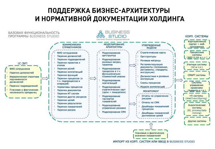 На рисунке ниже представлена целевая схема, демонстрирующая поддержку бизнес-архитектуры и нормативной документации при помощи различных корпоративных информационных систем холдинга.