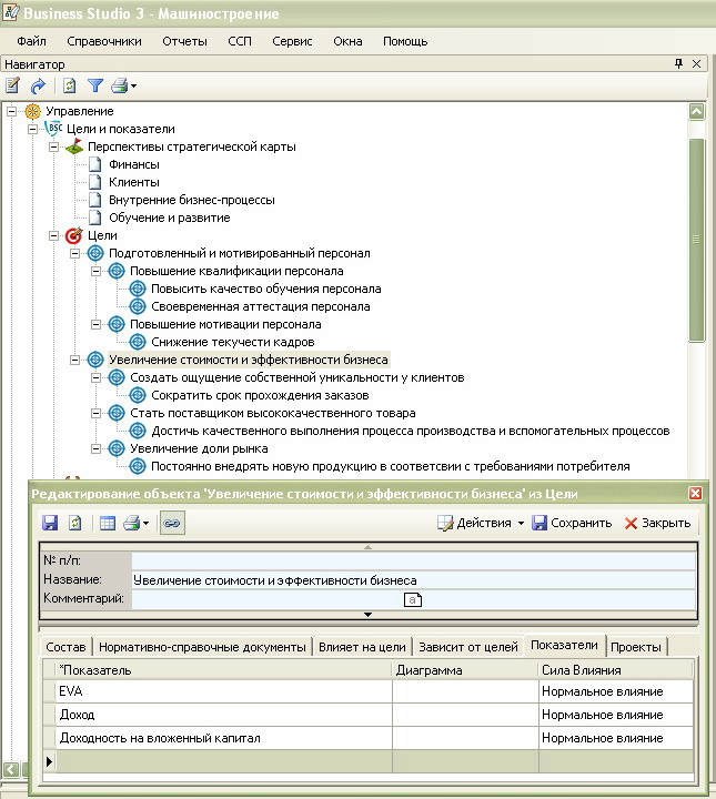 Каждой из целей должен соответствовать один или несколько показателей, по которым можно судить о достижении цели. Например, на рисунке 2 цели «Увеличение стоимости и эффективности бизнеса» соответствуют 3 показателя: EVA (экономическая добавленная стоимость), Доход и Доходность на вложенный капитал. Дерево целей компании показывает, что должна достигнуть компания в целом (стратегические цели) и как стратегия будет реализовываться на операционном уровне (операционные цели или цели деятельности).