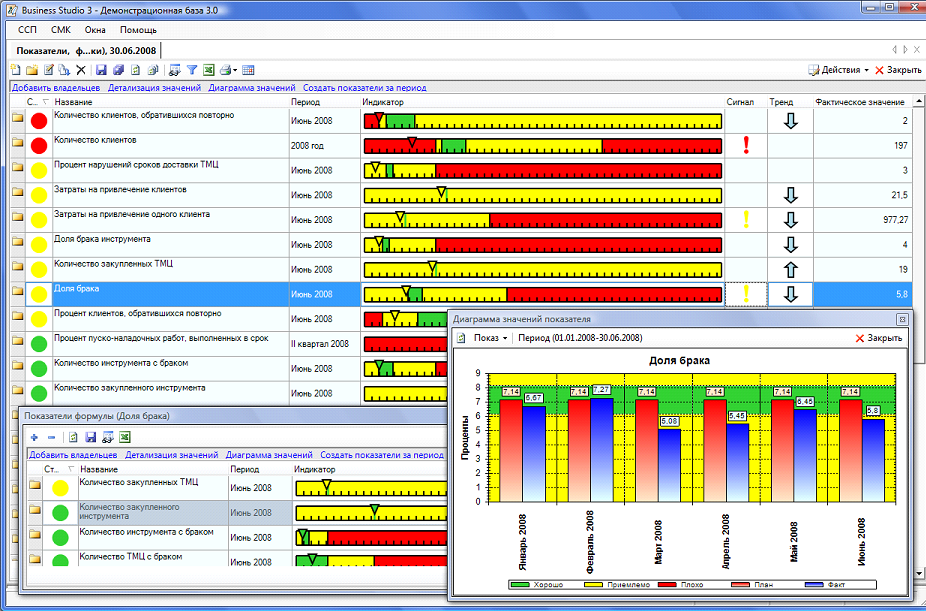 Для контроля и оценки KPI, анализа несоответствий и причин их возникновения удобно использовать «приборные панели», реализованные в системе Business Studio.