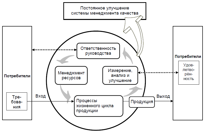 Эволюция развития подхода от управления качеством продукции — до всеобщего управления качеством деятельности организации предполагает создание и обеспечение результативного функционирования системы качества, включающей необходимые организационную структуру, процедуры, процессы и ресурсы [2].