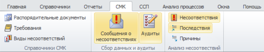 Процесс подготовки, проведения и анализа результатов аудита может быть реализован посредством информационных технологий в системе бизнес-моделирования «Business Studio», для этих целей в системе на вкладке «СМК» применяются соответствующие справочники (рис. 4).