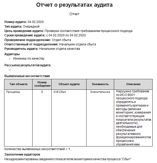 Для заполненной карточки аудита (рис. 5) может быть сформирован типовой отчет «Отчет о результатах аудита» (рис. 6).